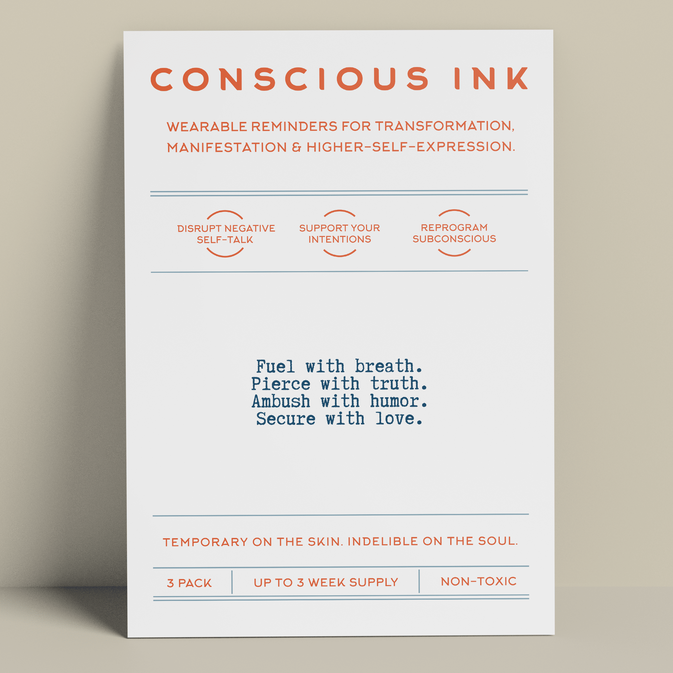 From Conscious Ink founder Frank Gjata, this Manifestation Tattoo is a rallying call to step into your conscious masculine energy—rooted, aware, and heart-led. Breathe deeply to stay grounded, speak truth to stay aligned, laugh freely to stay light, and love fully to stay connected. Wear it as your daily strategy for embodied strength, mindful action, and soulful presence. Fuel with breath. Pierce with truth. Ambush with humor. Secure with love. Manifestation Temporary Tattoo size 2.5"x1.5"