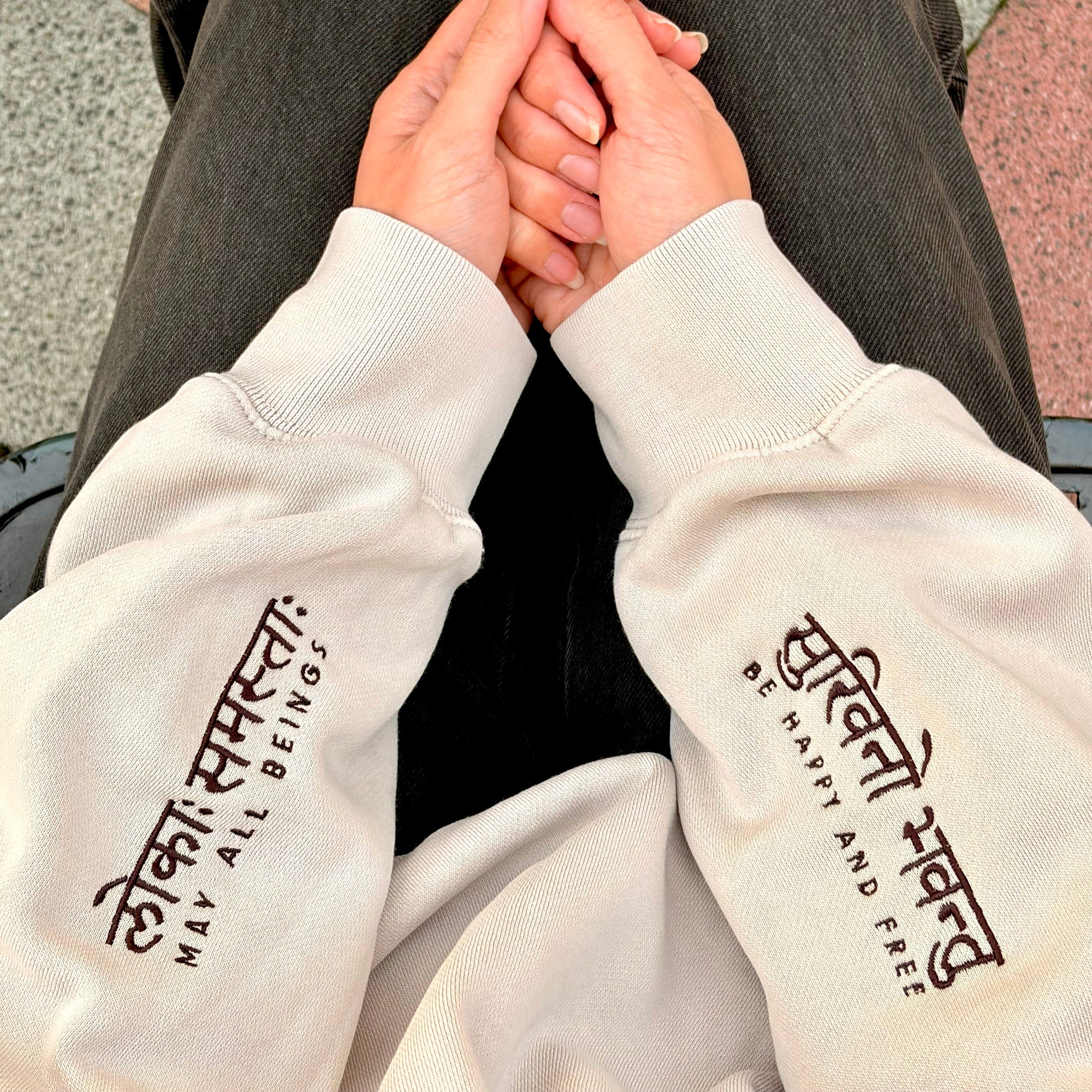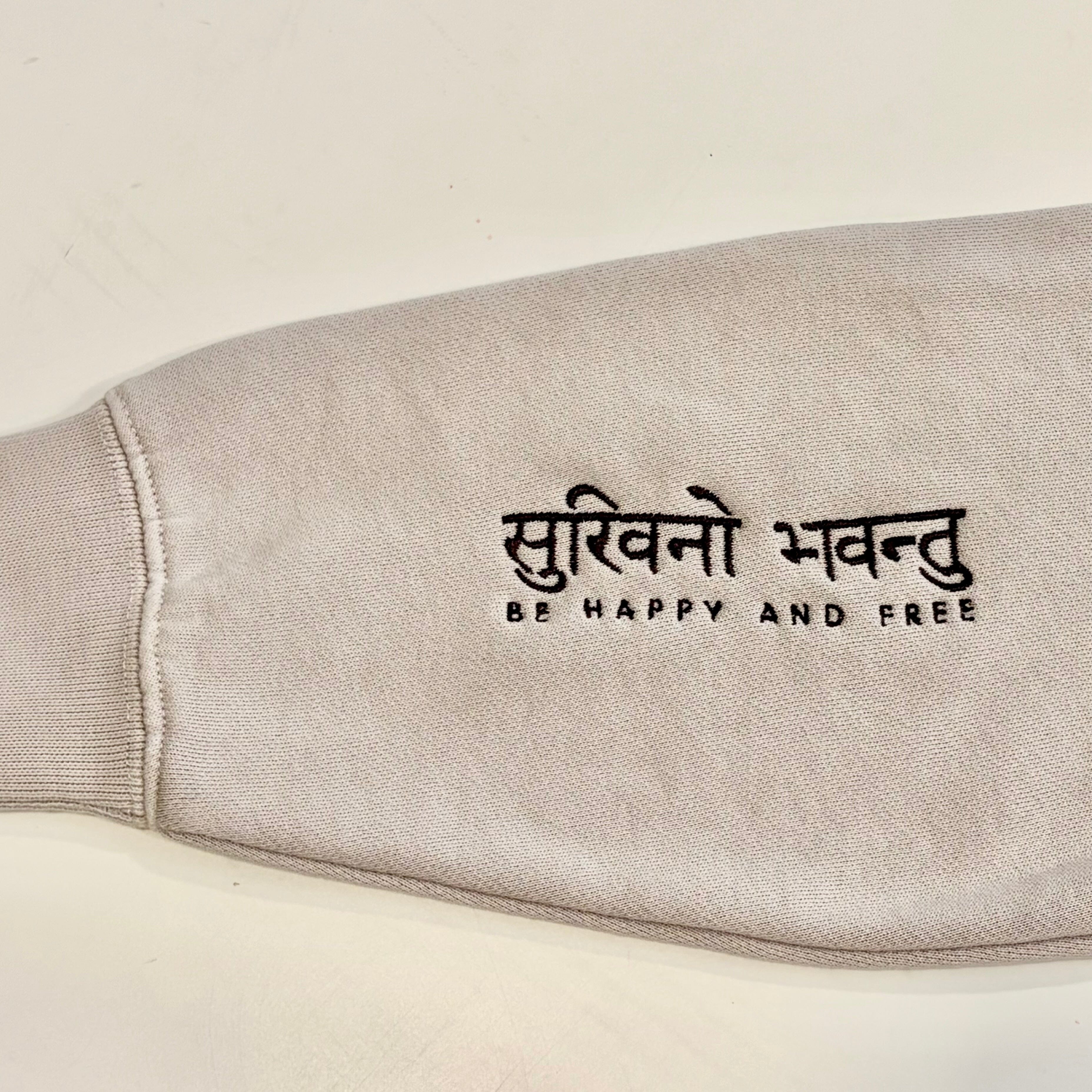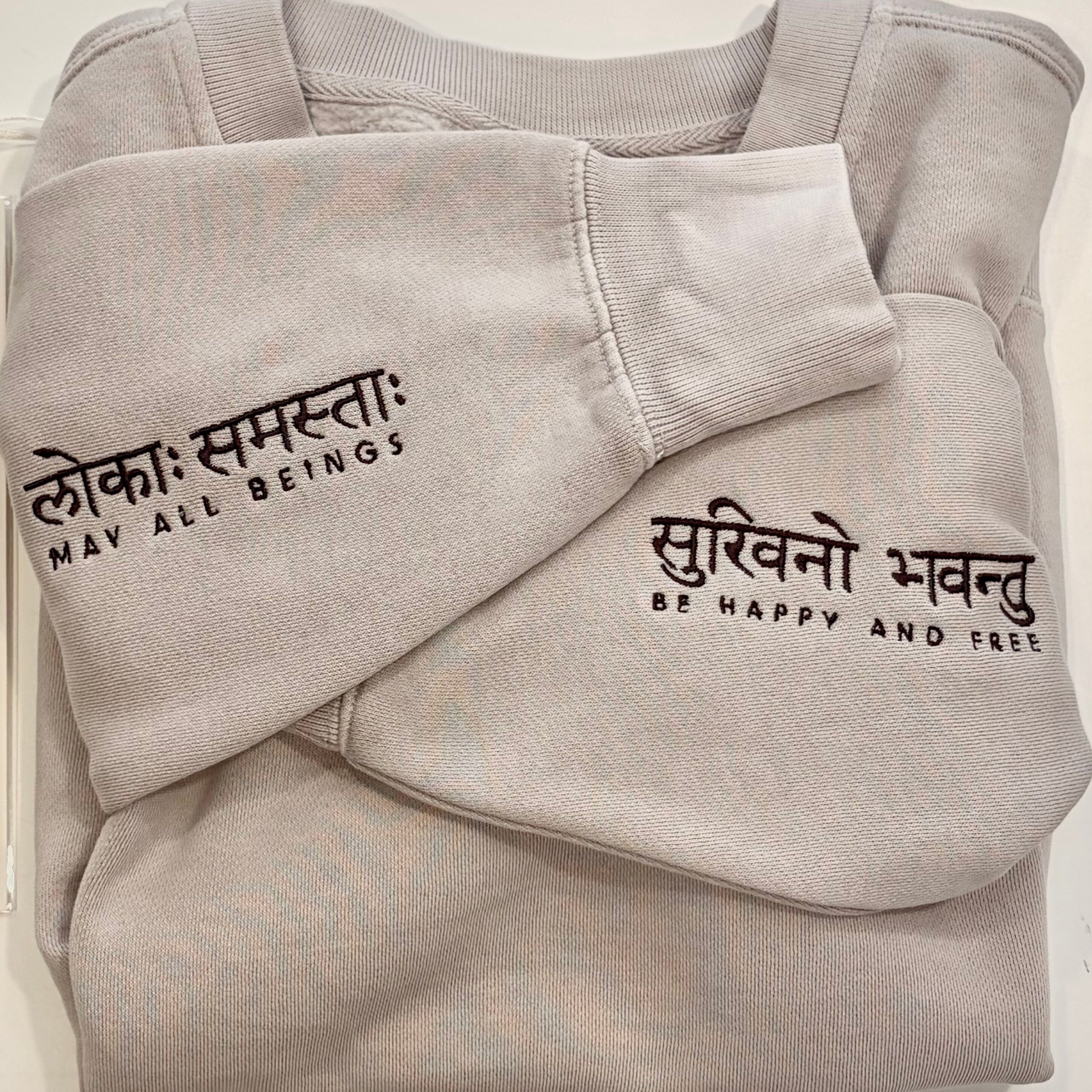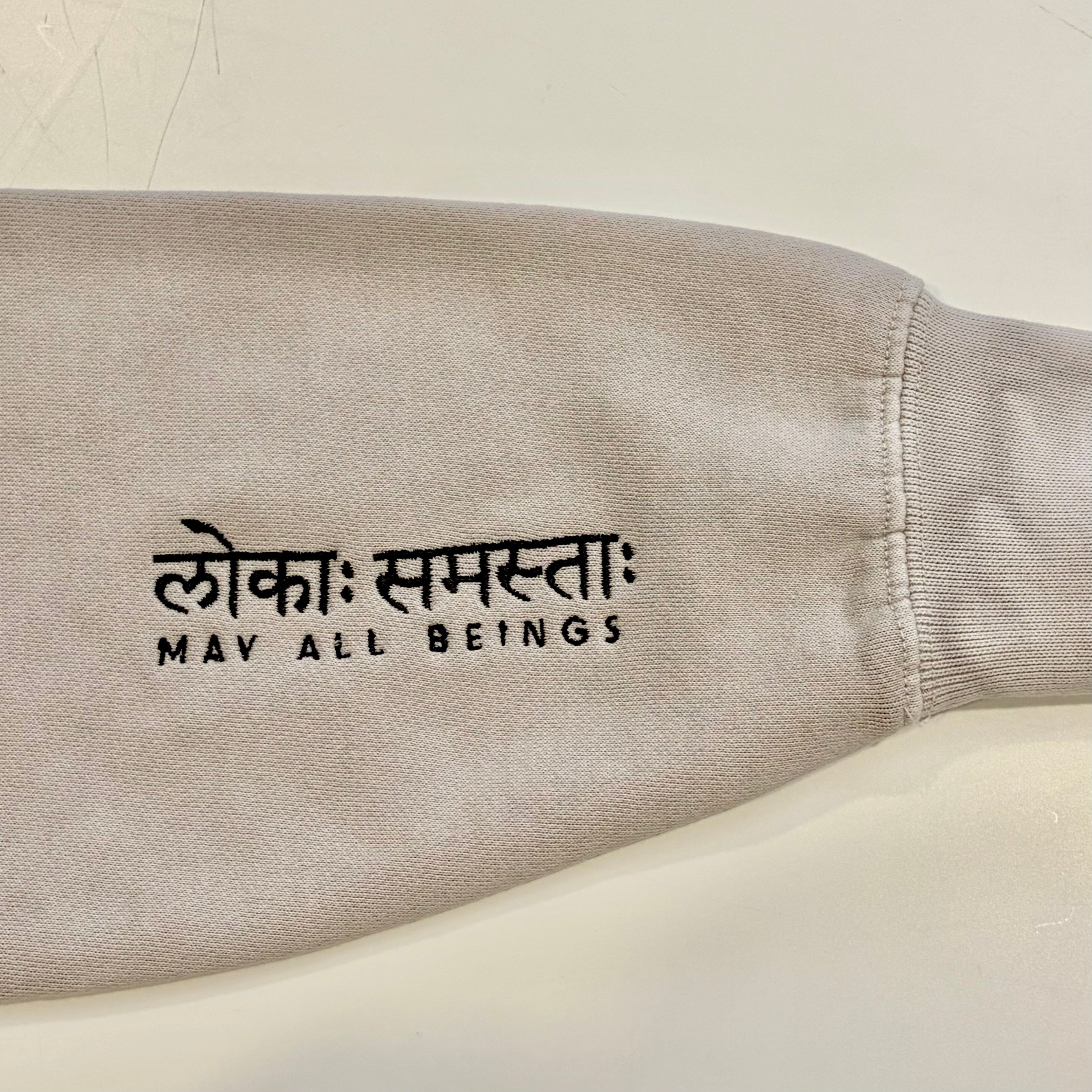 This faded bone crew is ready to work for you, reminding you to invoke compassion to yourself and others throughout your day with its elegantly embroidered cuffs that read "May All Beings Be Happy And Free" including the translation. Relaxed fit with dropped shoulders, pullover crew, anti-pill fleece, soft and cozy, sleeve cuff ribbing. True to size.